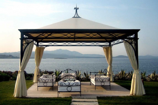 Кованые беседки для дачи смотрятся очень изящно в окружении цветущих кустарников и плодовых деревьев. Максимального эффекта можно достичь, если установить постройку возле сооружений с подобным дизайном. Вы можете дополнить сад коваными элементами декора – ажурными вазонами для цветов, навесами, стульями и так далее. Если все детали будут выполнены в одном стиле, ваш двор будет выглядеть непревзойденно. Ваши гости будут в восторге от изящной ажурной ковки, которой украшается кованая беседка и другие элементы сада.
