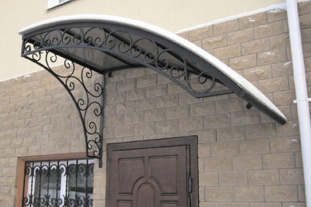 Кованые козырьки, выполняемые в соответствии с дизайном экстерьера, могут иметь арочную или полукруглую форму. Для придания большей функциональности крыша козырька делается односкатной. Такие конструкции прикрепляются к стене. Для дополнительной надежности они могут соединяться с металлическими опорами, которые монтируются на крыльцо. Чтобы композиция выглядела более эстетичной, эти элементы могут использоваться в качестве опорной части лестницы.