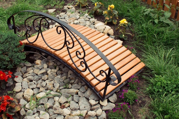 Для обустройства территории частных домов все чаще используются декоративные кованые садовые мостики. Они имеют небольшие габариты и прекрасно вписываются в сады любых размеров. Современные ландшафтные дизайнеры часто создают небольшие искусственные пруды, которые наполняются красивыми водорослями.