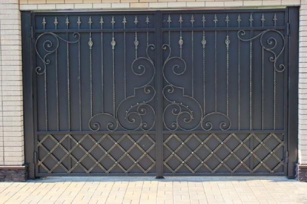 Вариантов оформления гаражных кованных ворот есть масса. Можно проявить свою фантазию и сделать их уникальными с помощью кованых элементов. Важно учитывать, что поковки должны быть вписаны в тело конструкции, выглядеть с ней единым целым. Гаражные ворота из металла достаточно прочные, устойчивые к коррозионному износу, не подвержены разрушительному воздействию перепадов температур.