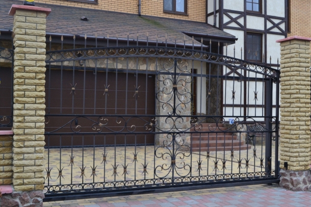 Откатные кованые ворота – универсальная конструкция, которая подойдет для любого дома. Благодаря откатным моделям ворот сохраняется большая часть свободного пространства во дворе. Они прекрасно подходят для монтирования на участках, имеющих небольшую территорию и удобны в эксплуатации. При декорировании ворот используются элементы, хорошо сочетающиеся с различными материалами.