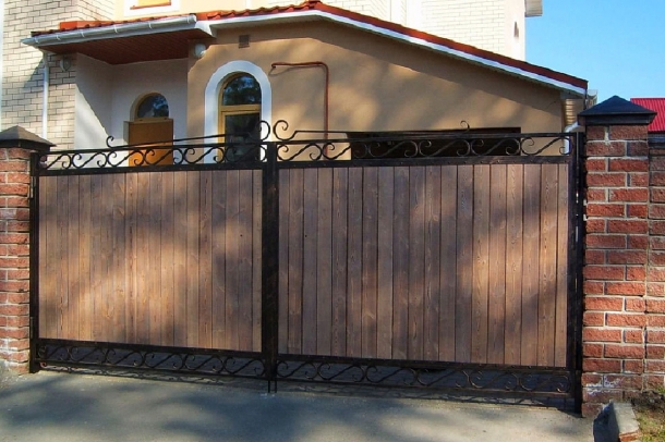 Деревянные ворота с ковкой являются очень важной частью любого участка. Они выделяются на общем фоне своим привлекательным внешним видом и достаточно высокими показателями надежности и долговечности. Преимуществами кованых ворот с деревянными вставками являются: надежность, небольшой вес, привлекательность и ремонтопригодность.