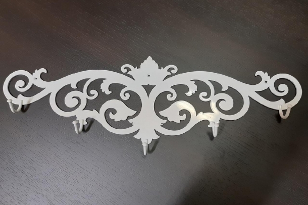 Методом лазерной резки делают открытые ключницы, которые представляют собой резную панель с крючками. Изделие занимает мало места, и его легко можно разместить на стенке шкафа в прихожей.