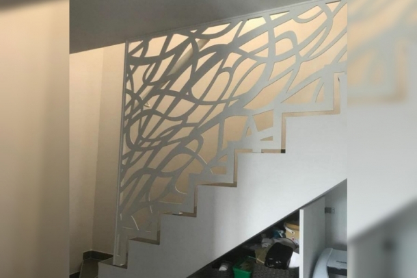 Ограждение лестницы для загородного дачного участка может быть выполнено из обычного профилированного металлического листа или металлической трубы с квадратным сечением. Лазерная резка позволяет сделать ограждение лестницы, забор или ворота из металла не только функциональным элементом, но и арт-объектом для оформления дизайна.