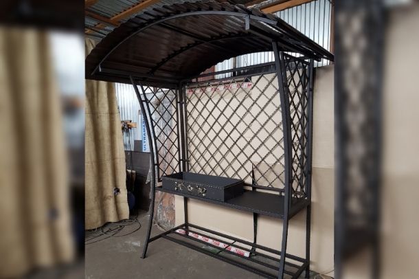 Возле кованого мангала лофт можно установить скамейку и столик в стиле лофт, небольшой навес или беседку. Так будет создана зоны отдыха, в которой будет приятно проводить время, готовить вкусную еду, находясь вместе с гостями на свежем воздухе.