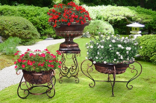 К преимуществам кованых садовых вазонов стоит отнести:
